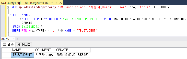 WHERE RTRIM(A.XTYPE) = 'U' AND NAME = [테이블명]