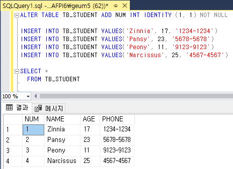 ALTER TABLE [테이블명] ADD [컬럼명] [숫자형 데이터 형식] IDENTITY ([초기값], [증가값]) [제약조건]