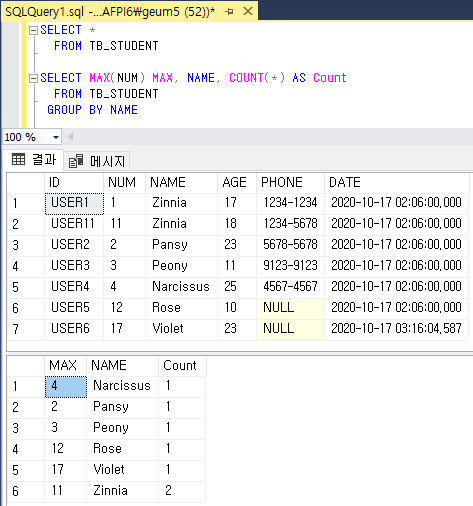 중복된 NAME 중 최대 NUM 값, 중복 제거 된 NAME 데이터, 중복 데이터 개수