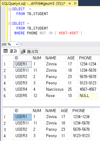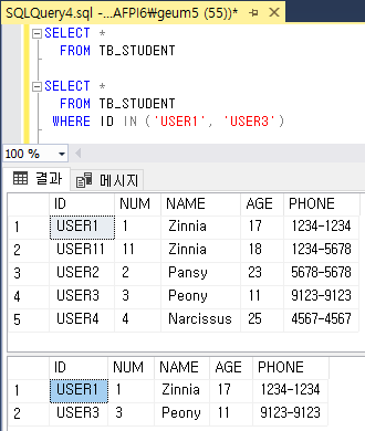 조건값 포함 된 데이터 조회(IN), 조건값 제외 한 데이터 조회(NOT IN)