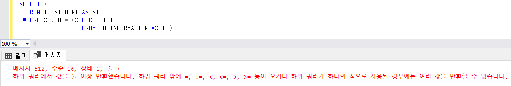 서브 쿼리 결과 건수가 여러개인 경우 에러