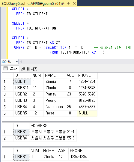 WHERE [조건1] = (SELECT TOP 1 [필드]