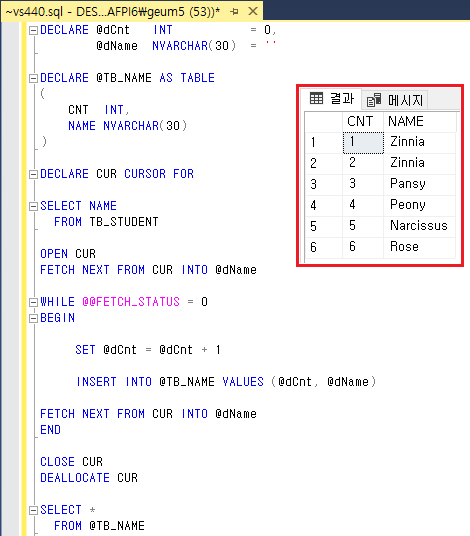 -- @@FETCH_STATUS 이상이 없는 경우 0, 실패했거나 행이 결과 집합의 범위를 벗어난 경우 -1, 행(Row) 없는 경우 -2