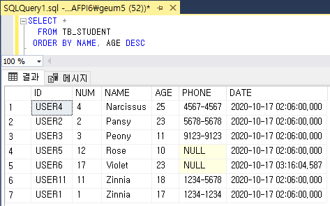 NAME은 오름차순(ASC), AGE는 내림차순(DESC) 조회