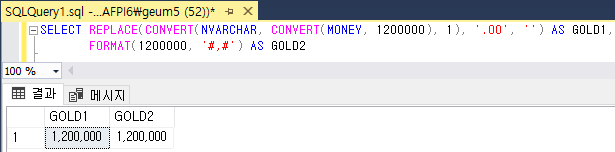 SELECT REPLACE(CONVERT(NVARCHAR, CONVERT(MONEY, [금액]), 1), '.00', '')