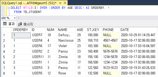 SELECT NTILE([등분]) OVER (ORDER BY [필드] ASC/DESC)