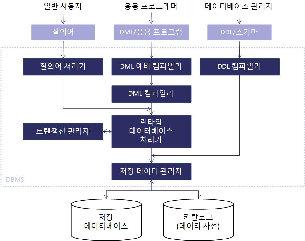 사용자와 데이터베이스 사이에 위차하여 데이터베이스를 관리하고 사용자가 요구하는 연산을 수행해서 정보를 생성해 주는 소프트웨어